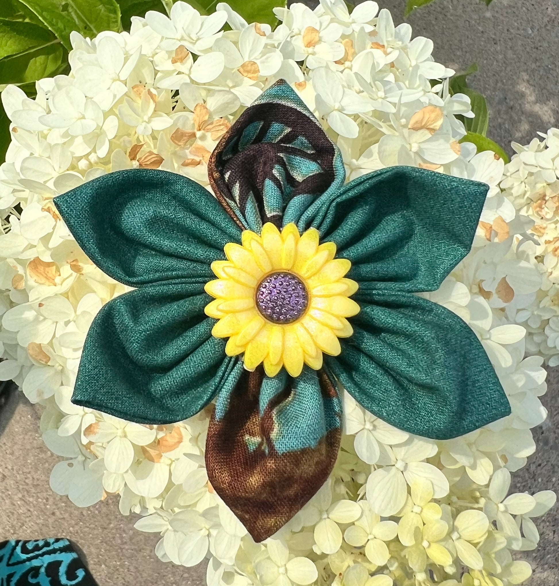 featuring teal & western themed fabric, with a glittering sunflower center.